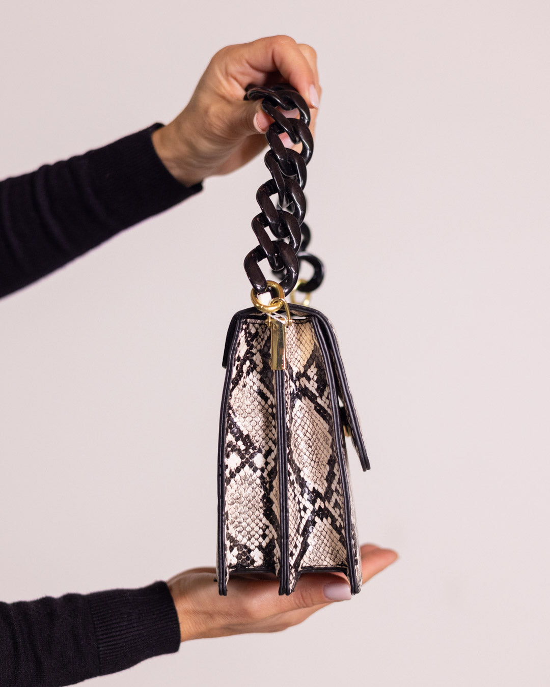 La borsa pitone compatta è l'ultima tendenza per un look alla moda. La catena corta in plastica rende la borsa comoda e resistente, perfetta per portare con te tutto ciò di cui hai bisogno in modo elegante e pratico. Un accessorio di tendenza che unisce moda e funzionalità.