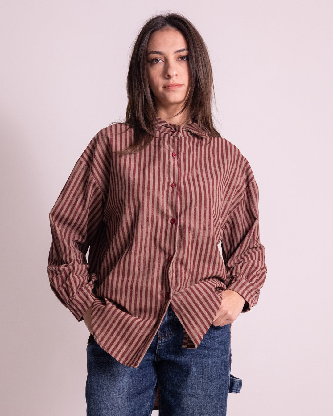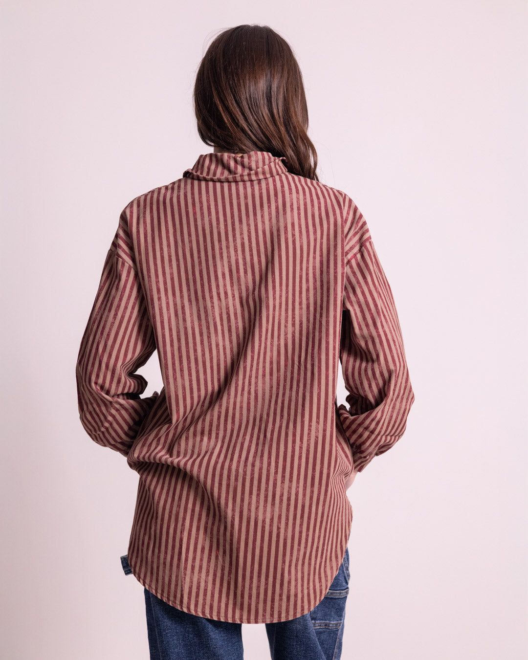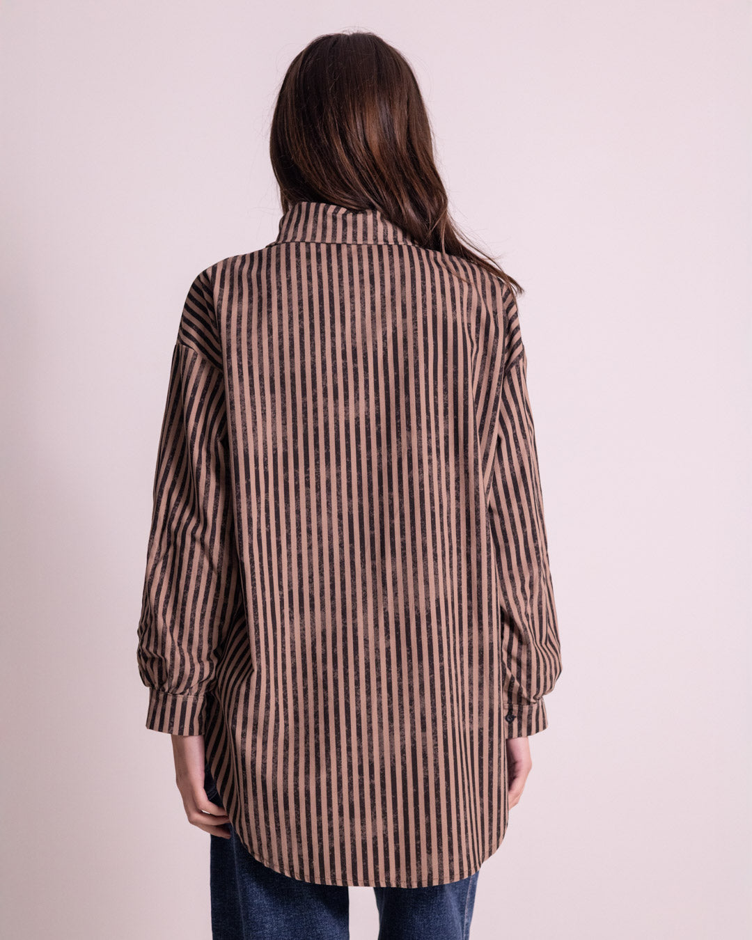 Camicione a righe realizzato in morbido tessuto a costine, caratterizzato da un taglio asimmetrico che lo rende più lungo nella parte posteriore. Questo capo combina comfort e stile contemporaneo, perfetto per chi ricerca un'alternativa sofisticata alla camicia classica. La texture costinata garantisce una vestibilità confortevole e una drappeggiatura elegante, mentre il pattern a righe aggiunge movimento e dinamismo al look. Ideale da indossare sia in abbinamenti casual che semi-formali.