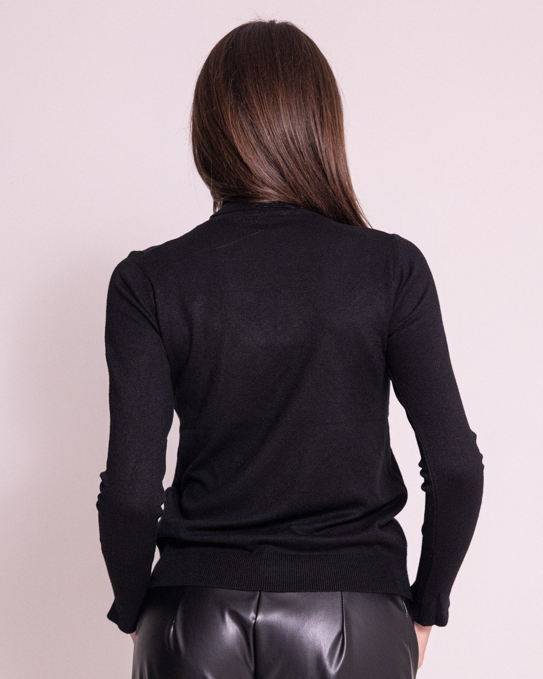 Maglione raffinato in tessuto elastico rasato con collo alto che valorizza il décolleté. I dettagli dorati sui polsi aggiungono un tocco di eleganza contemporanea. La composizione elasticizzata garantisce una vestibilità confortevole e adattabile, perfetta per taglie dalla S alla XL. Un capo versatile ideale per creare look sofisticati sia in contesti casual che più formali.