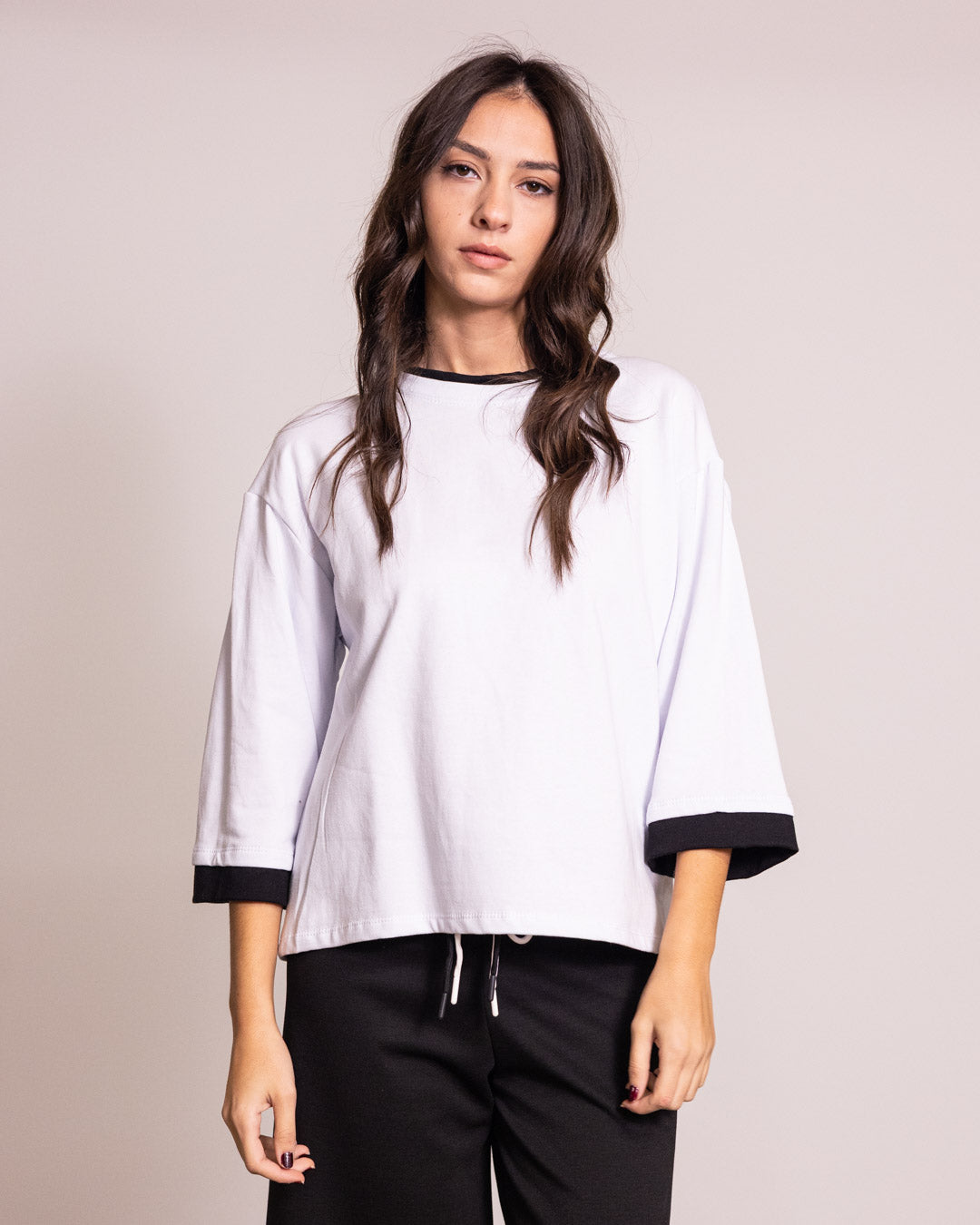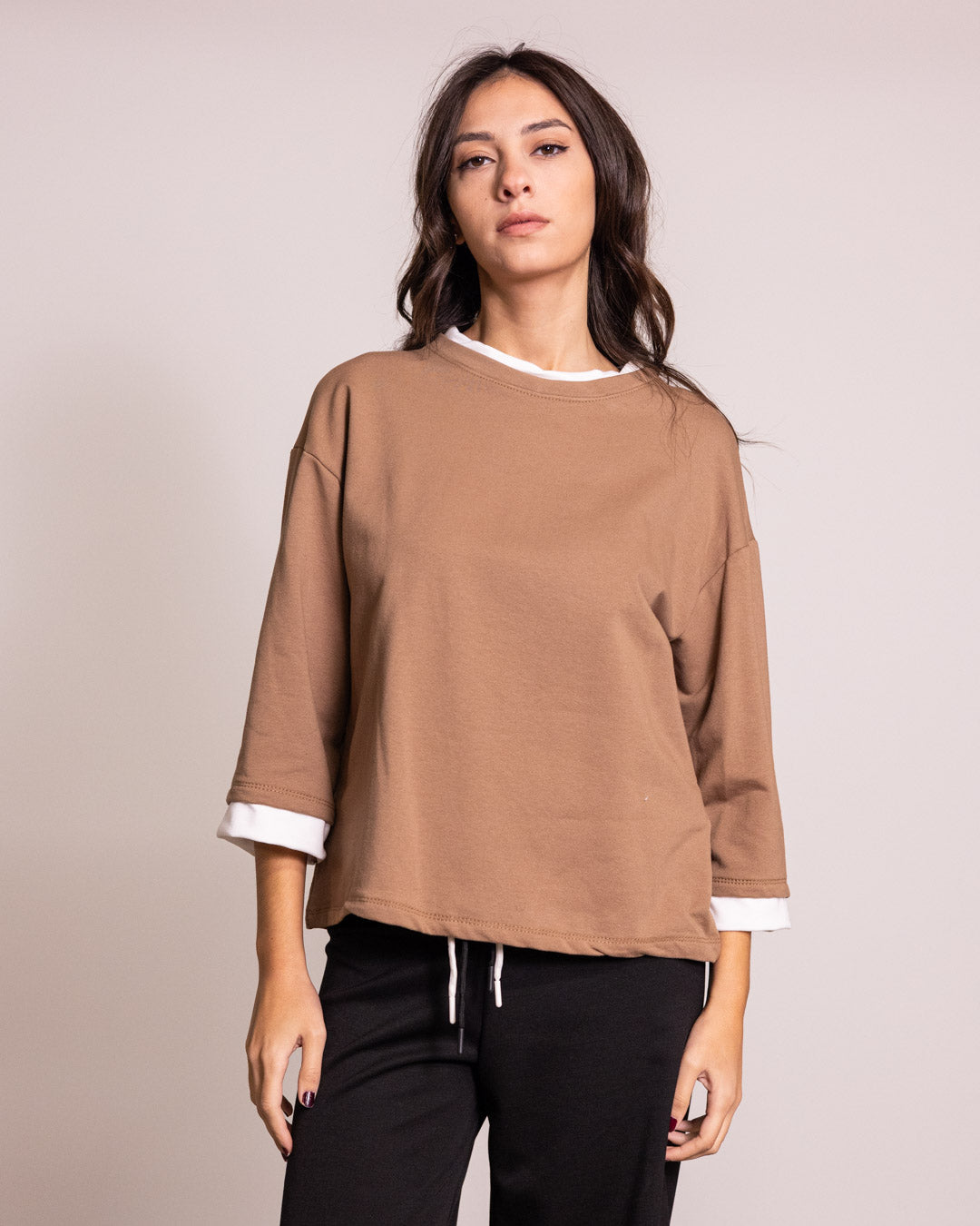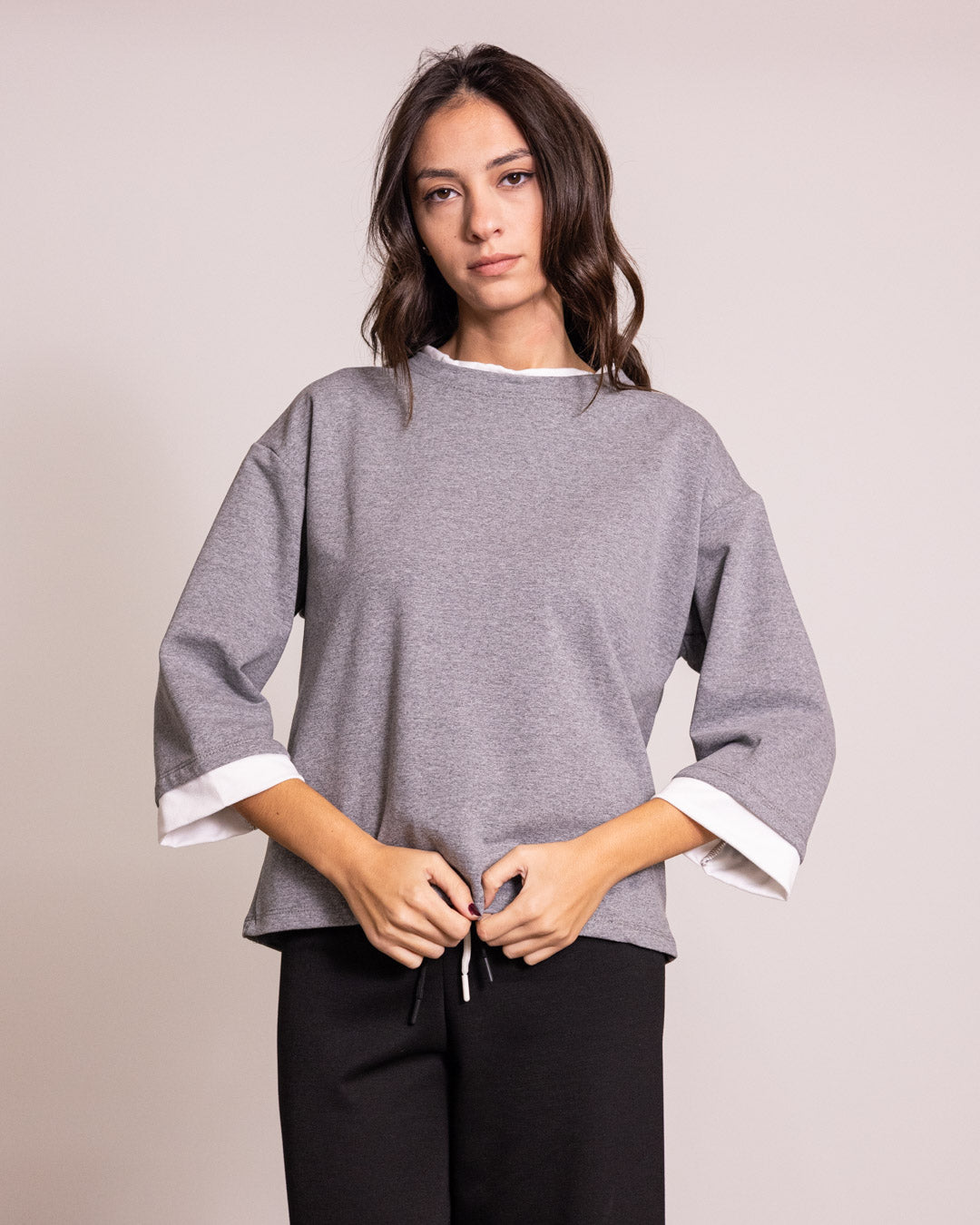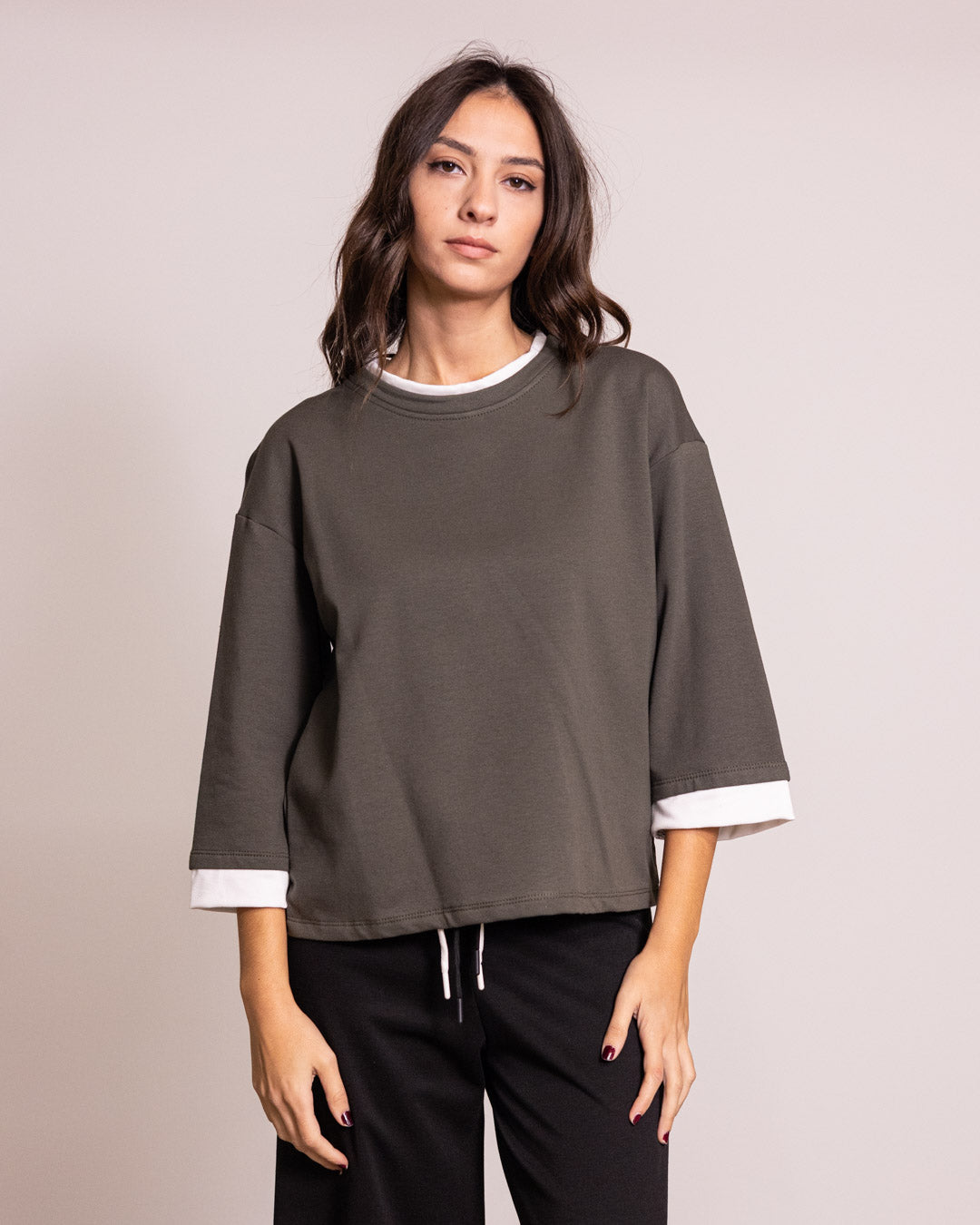 Felpa in taglia unica, realizzata in tessuto leggero e traspirante, ideale per la mezza stagione. Le maniche 3/4 offrono versatilità stilistica, mentre il risvolto in contrasto colore aggiunge un dettaglio di design ricercato. Perfetta per chi ricerca comfort senza compromessi estetici, si abbina facilmente a qualsiasi guardaroba. Un capo essenziale che combina praticità e eleganza contemporanea.