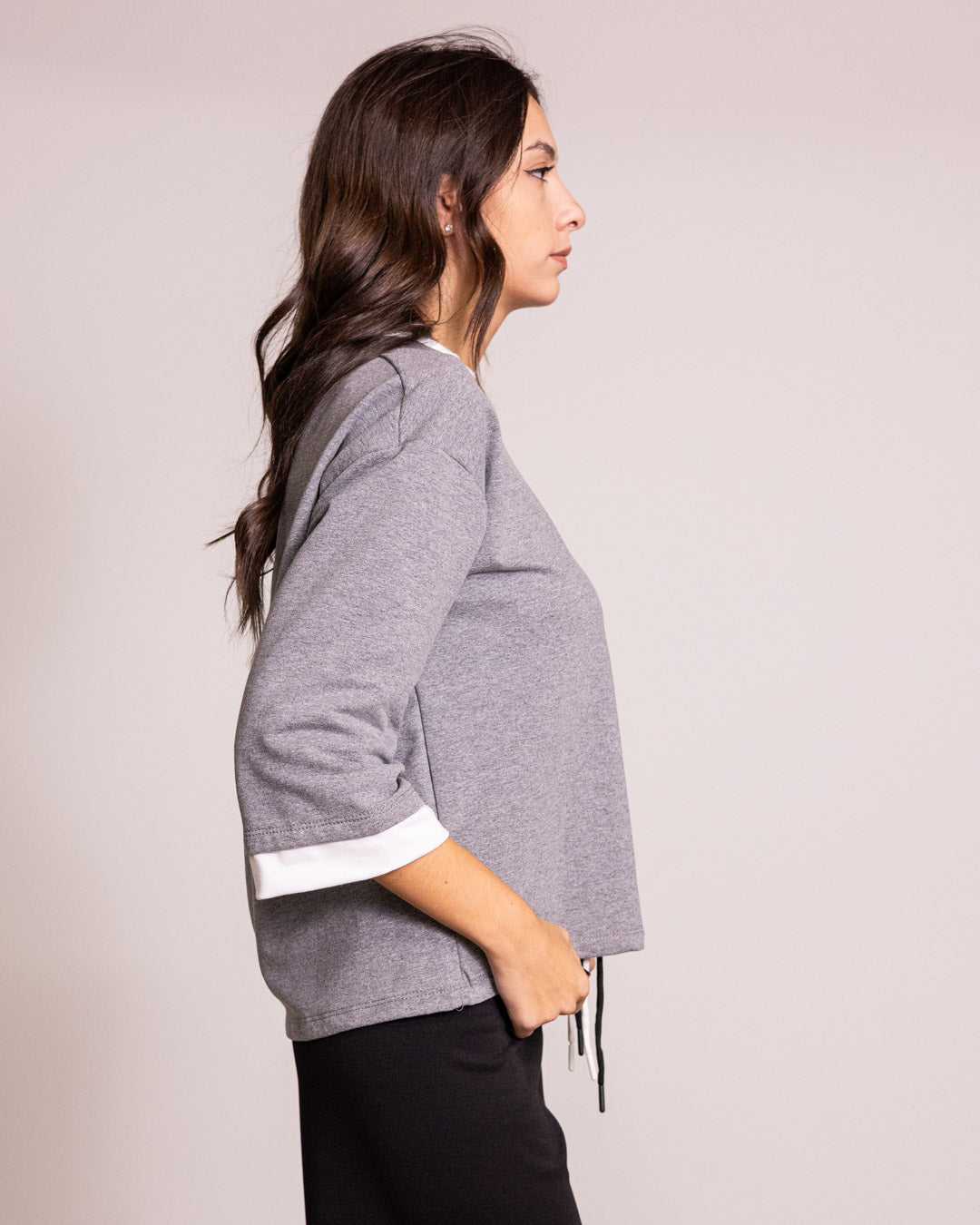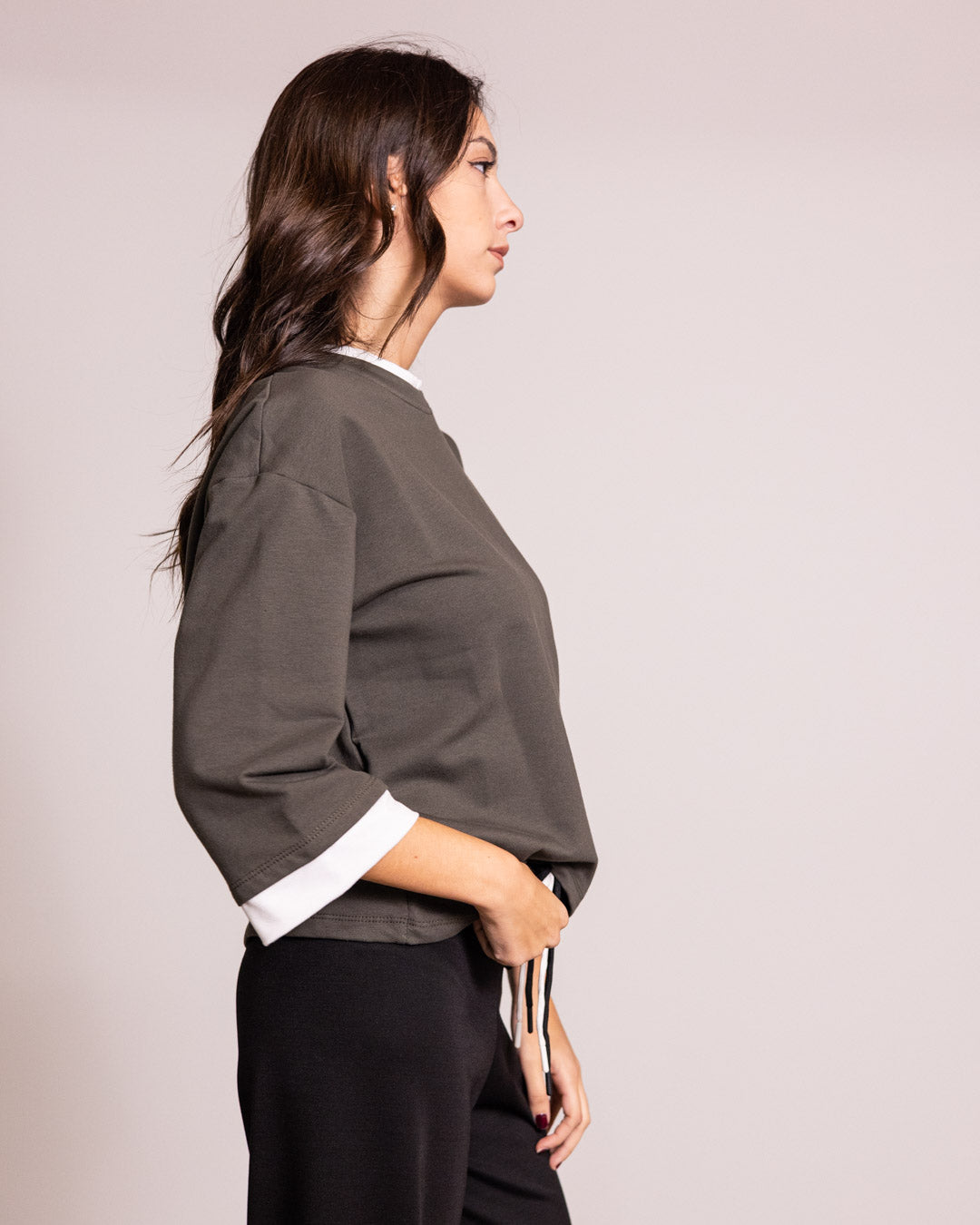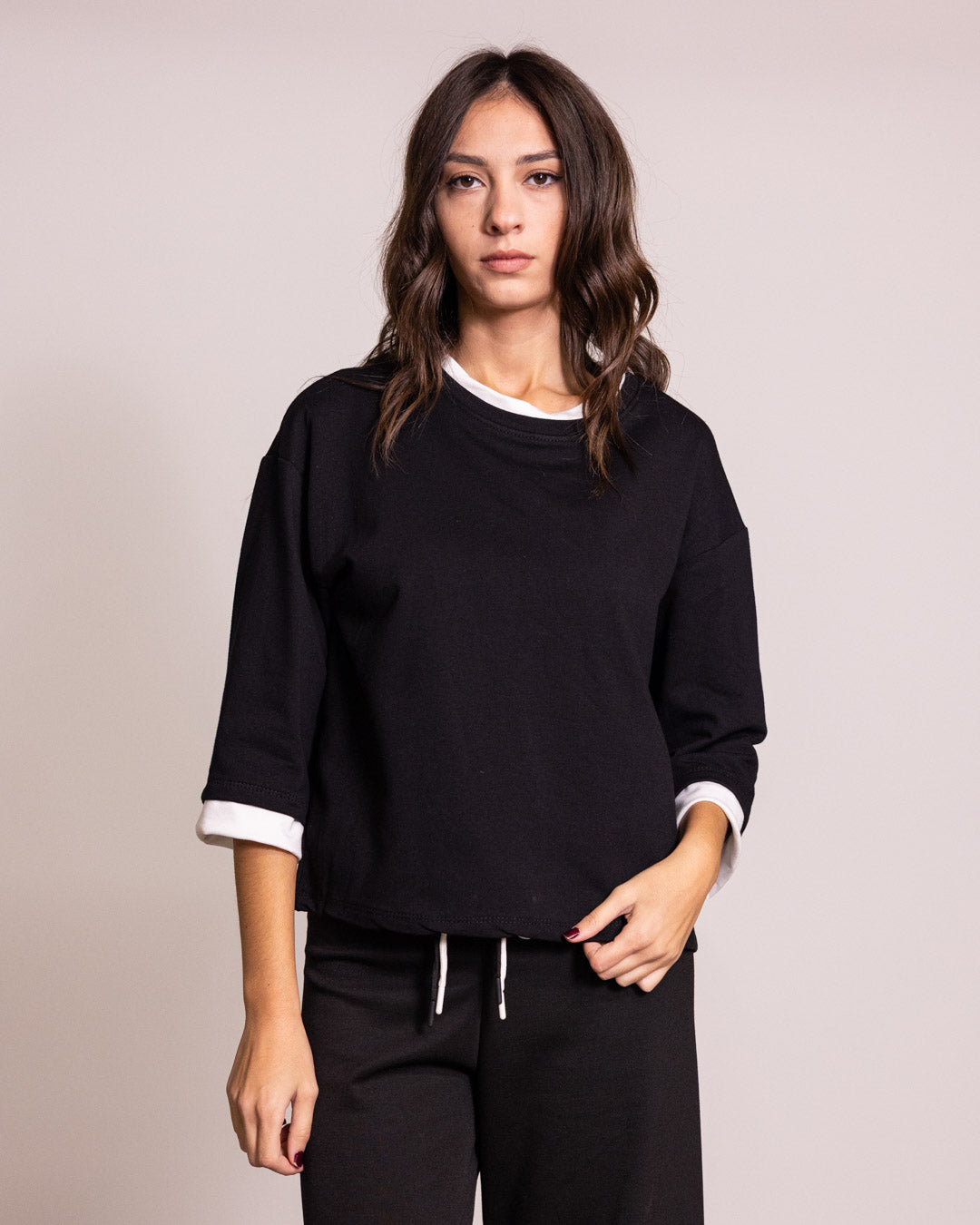 Felpa in taglia unica, realizzata in tessuto leggero e traspirante, ideale per la mezza stagione. Le maniche 3/4 offrono versatilità stilistica, mentre il risvolto in contrasto colore aggiunge un dettaglio di design ricercato. Perfetta per chi ricerca comfort senza compromessi estetici, si abbina facilmente a qualsiasi guardaroba. Un capo essenziale che combina praticità e eleganza contemporanea.