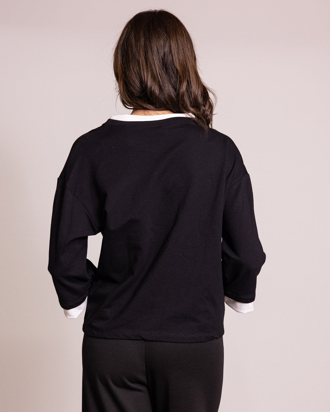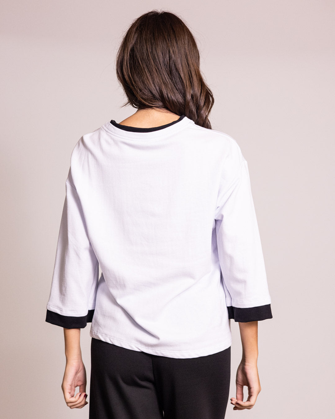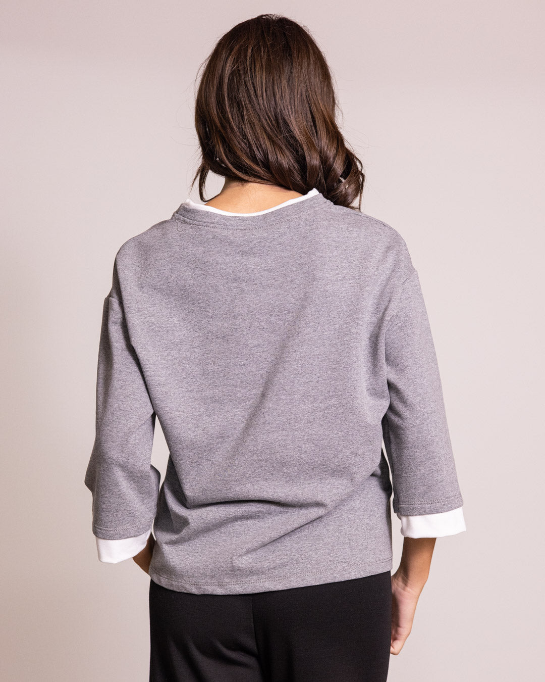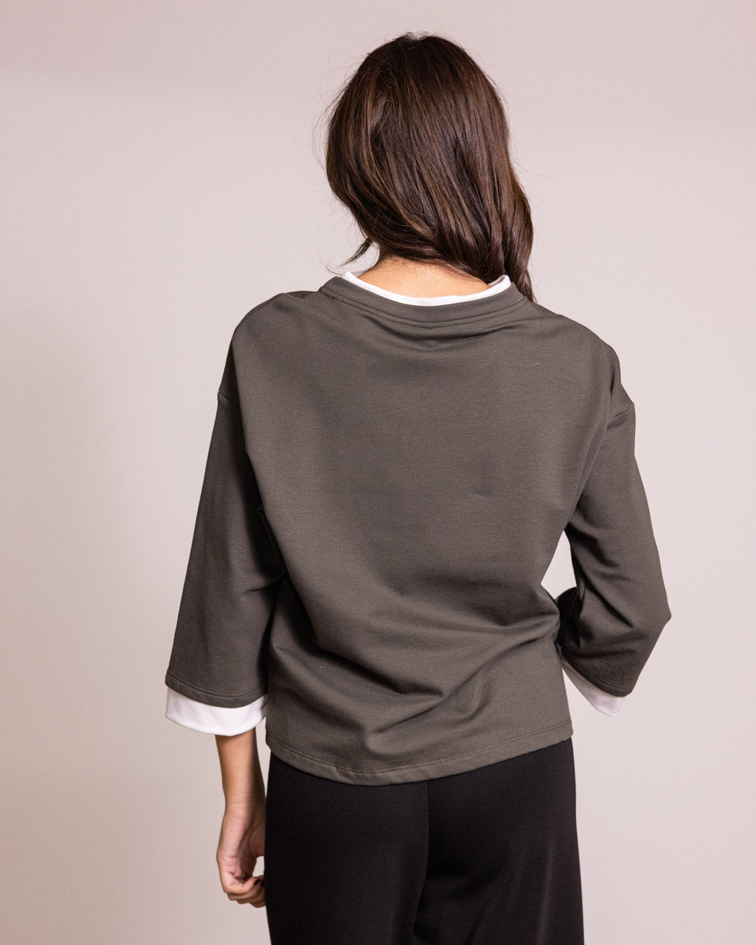 Felpa in taglia unica, realizzata in tessuto leggero e traspirante, ideale per la mezza stagione. Le maniche 3/4 offrono versatilità stilistica, mentre il risvolto in contrasto colore aggiunge un dettaglio di design ricercato. Perfetta per chi ricerca comfort senza compromessi estetici, si abbina facilmente a qualsiasi guardaroba. Un capo essenziale che combina praticità e eleganza contemporanea.