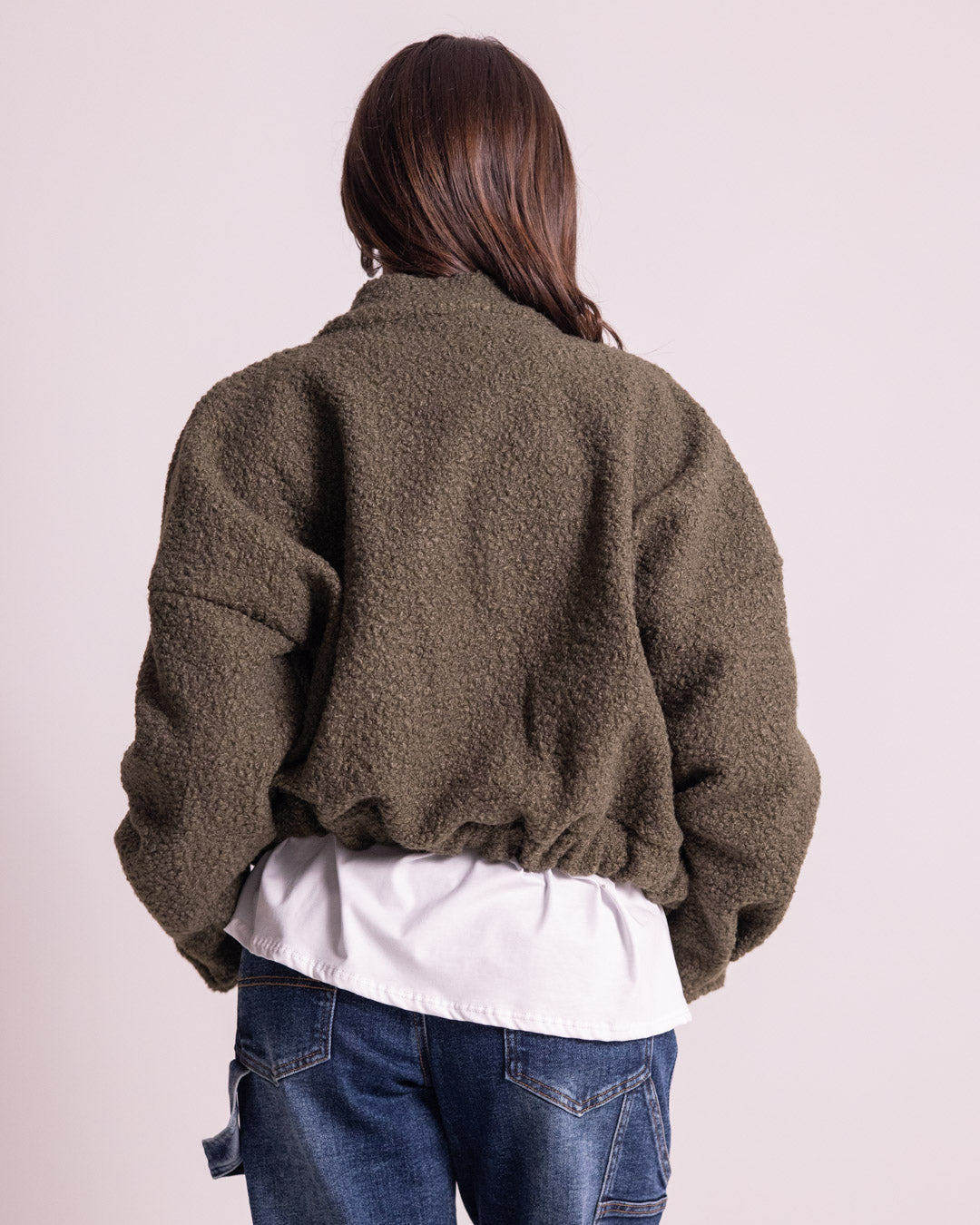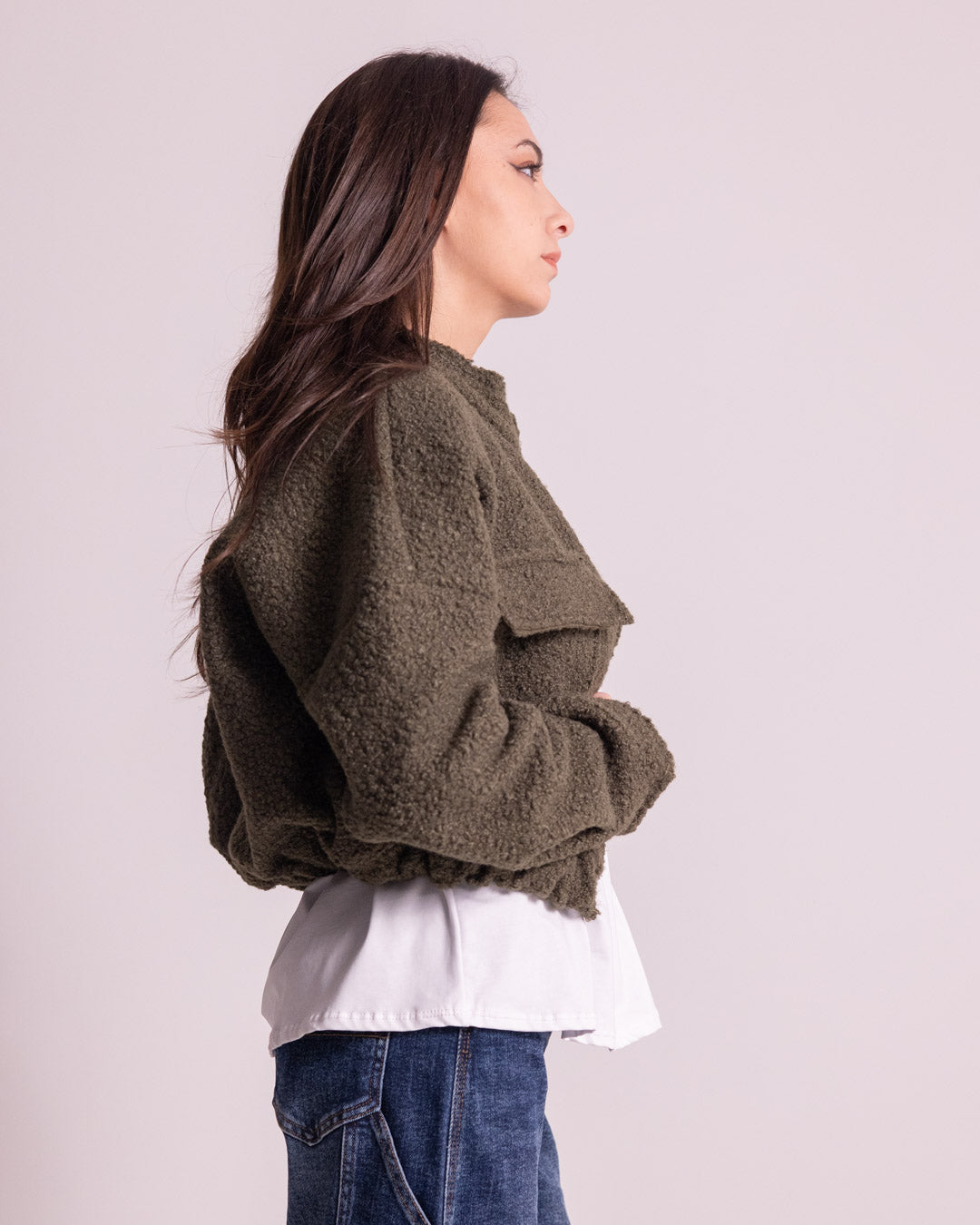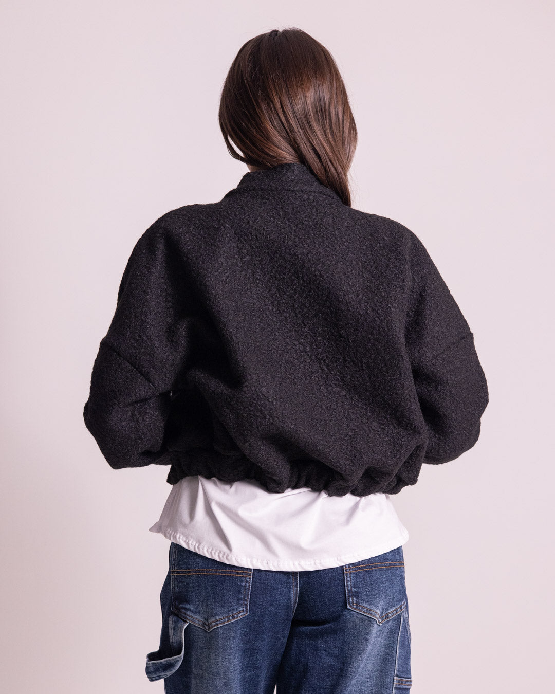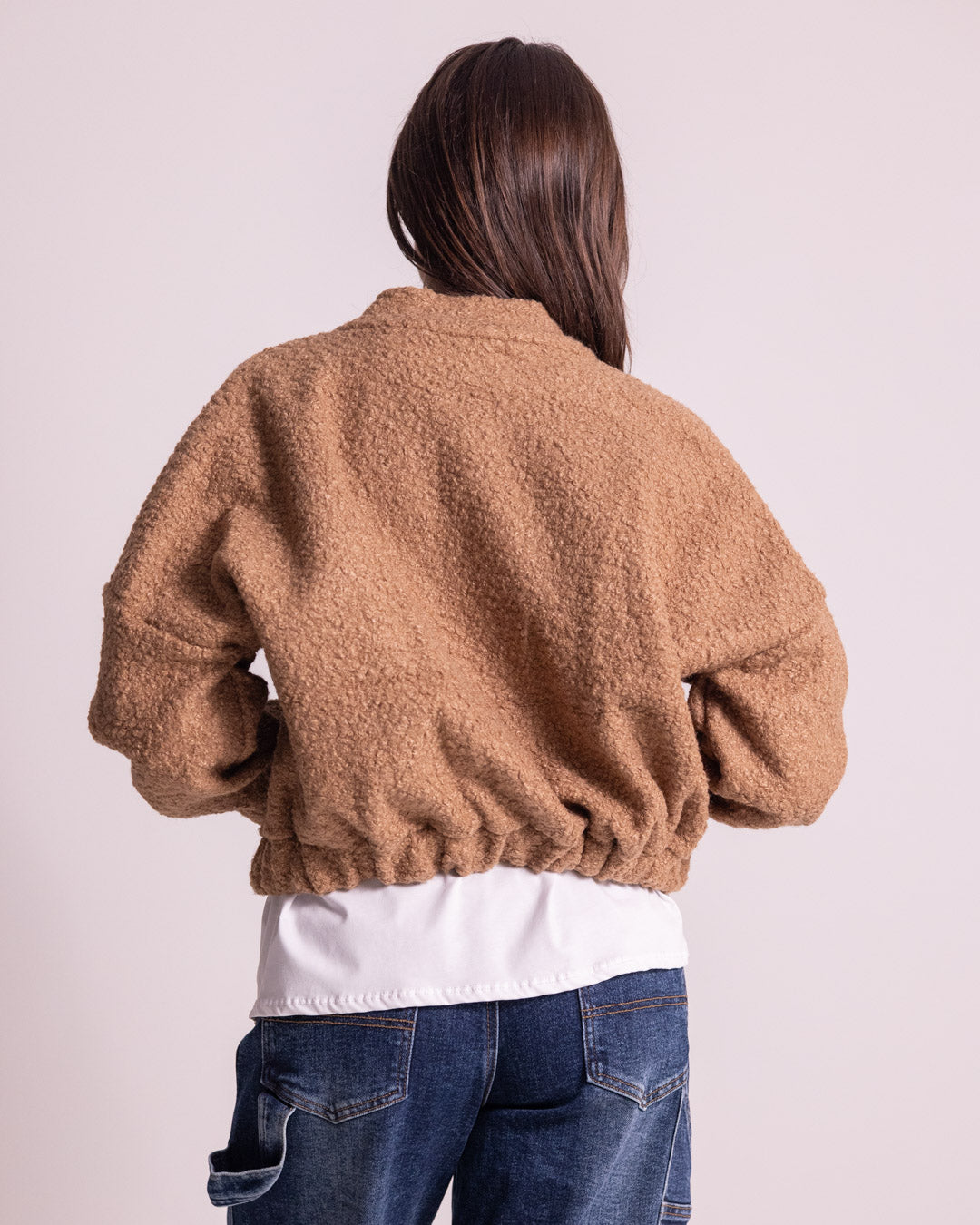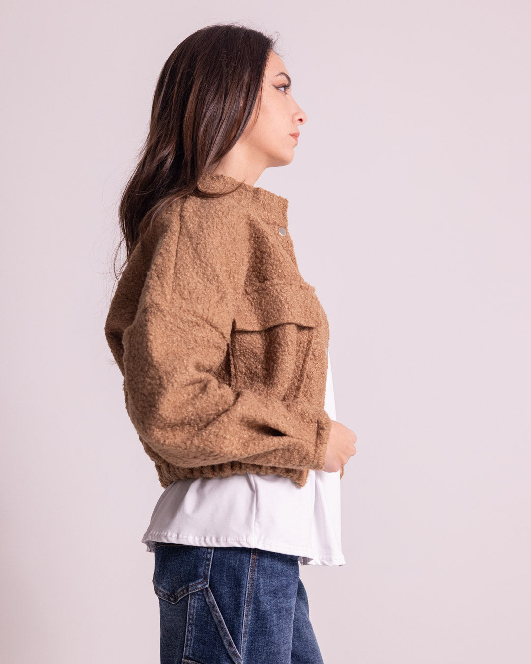 Giacca corta in morbido effetto teddy con chiusura a bottoni e elastico in vita che crea un affascinante effetto arricciato. Il design compatto valorizza la silhouette con una vestibilità ridotta, perfetto per chi desidera un capo versatile e contemporaneo. Taglia unica, vestibilità ridotta, ideale per chi veste dalla S alla L, garantisce comfort e stile in ogni occasione.