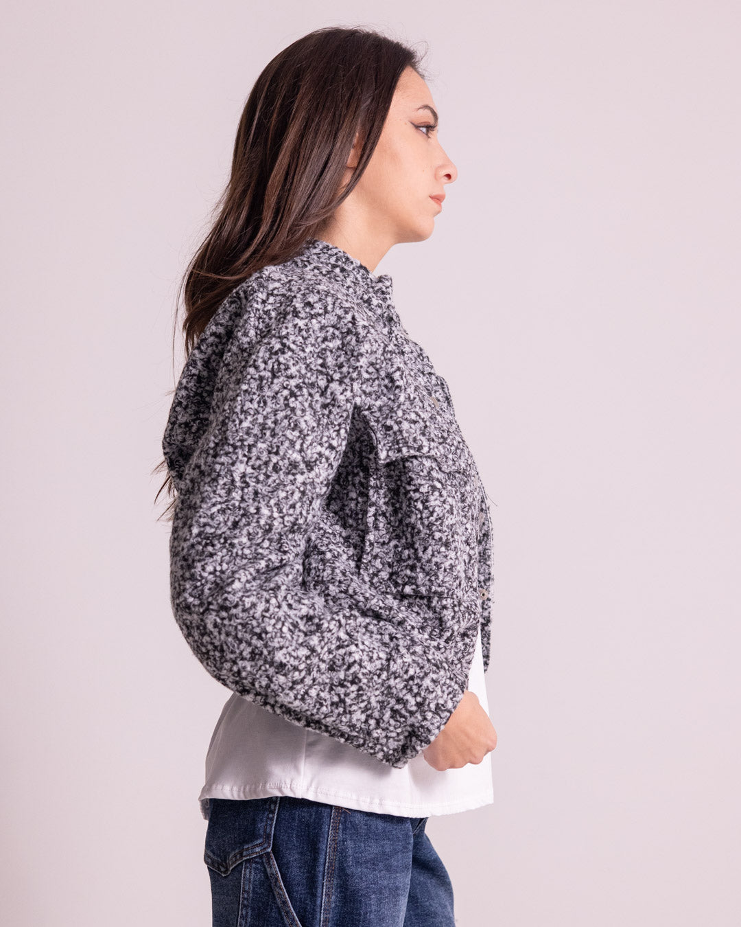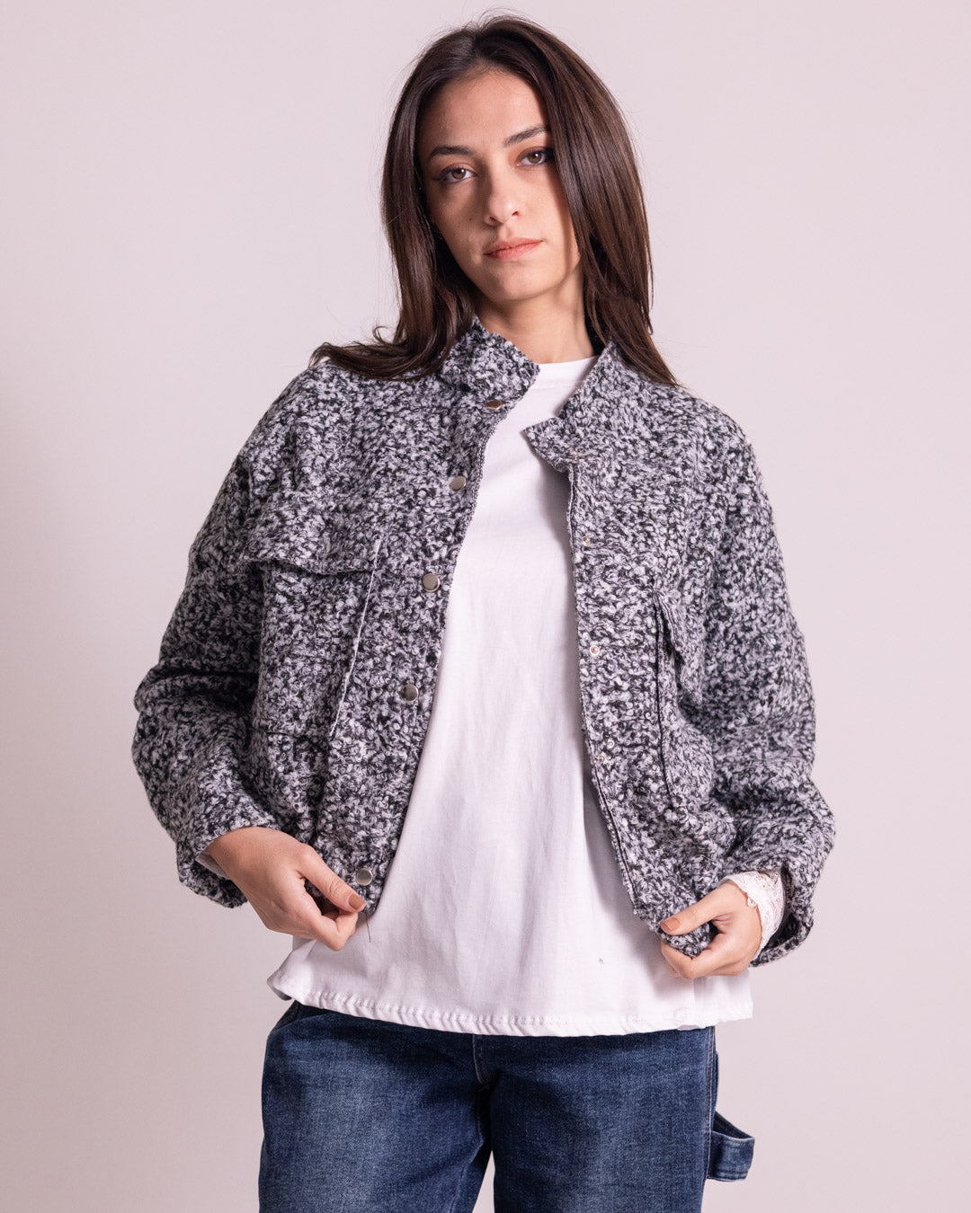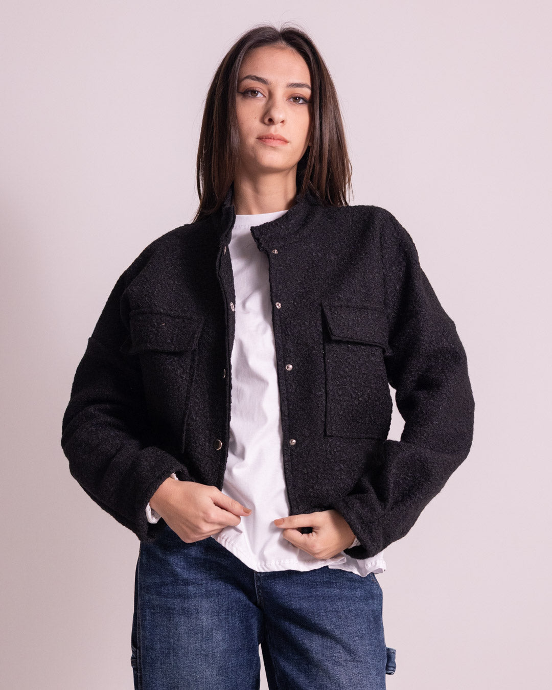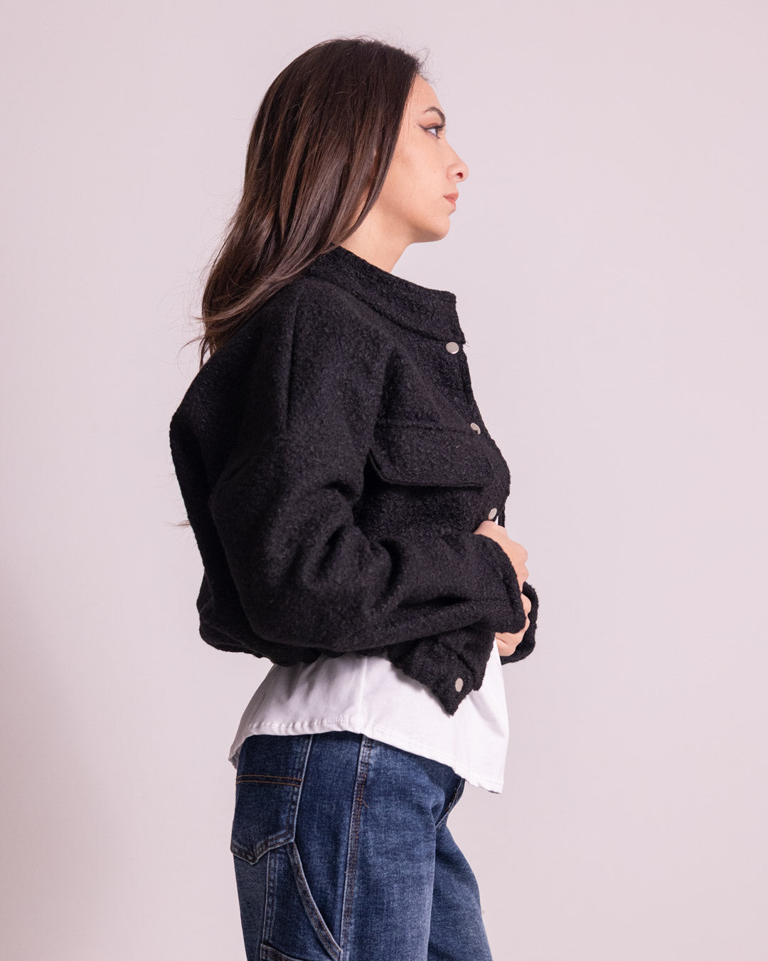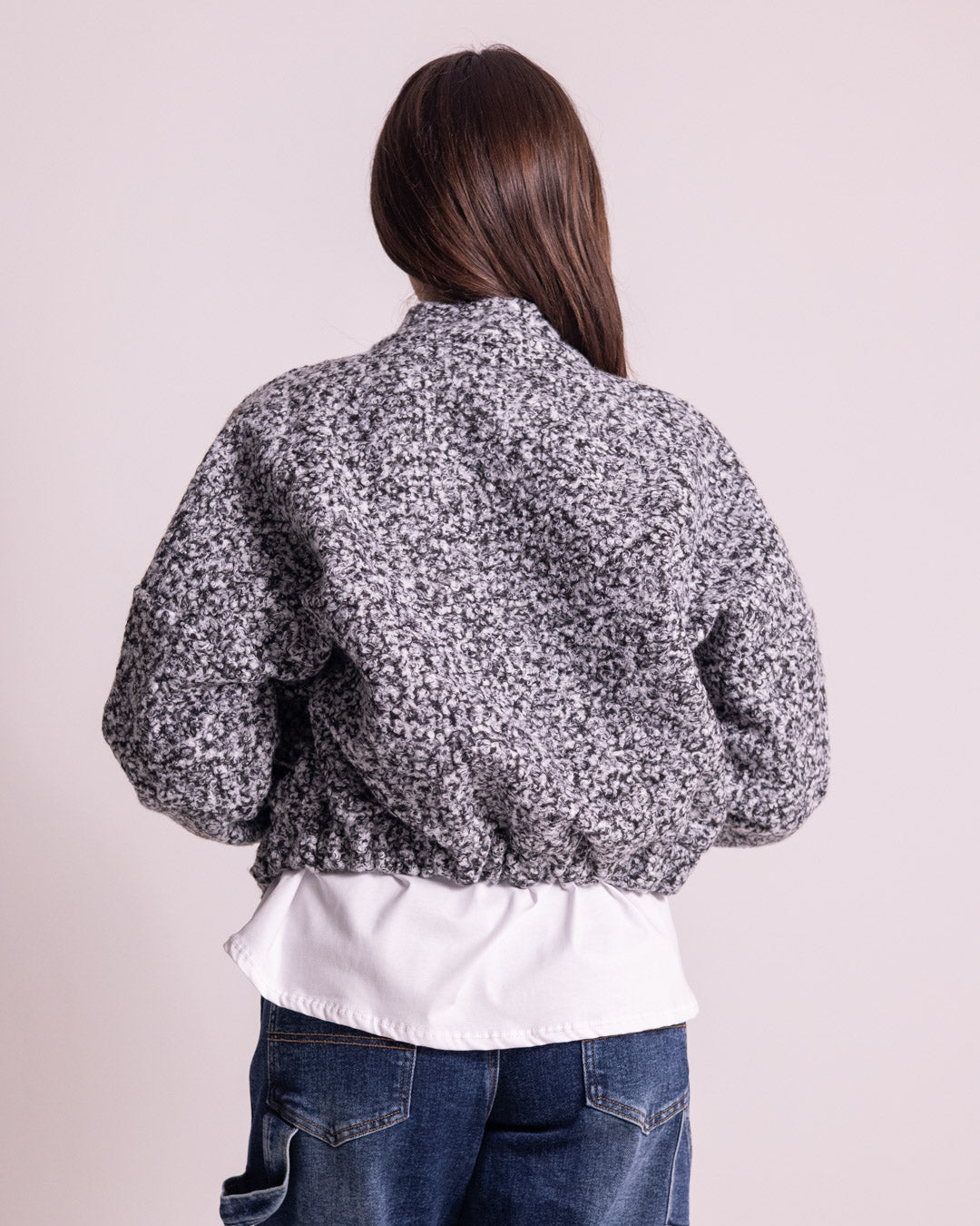 Giacca corta in morbido effetto teddy con chiusura a bottoni e elastico in vita che crea un affascinante effetto arricciato. Il design compatto valorizza la silhouette con una vestibilità ridotta, perfetto per chi desidera un capo versatile e contemporaneo. Taglia unica, vestibilità ridotta, ideale per chi veste dalla S alla L, garantisce comfort e stile in ogni occasione.