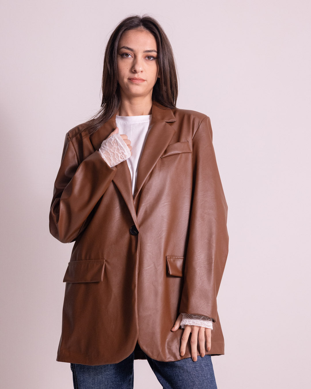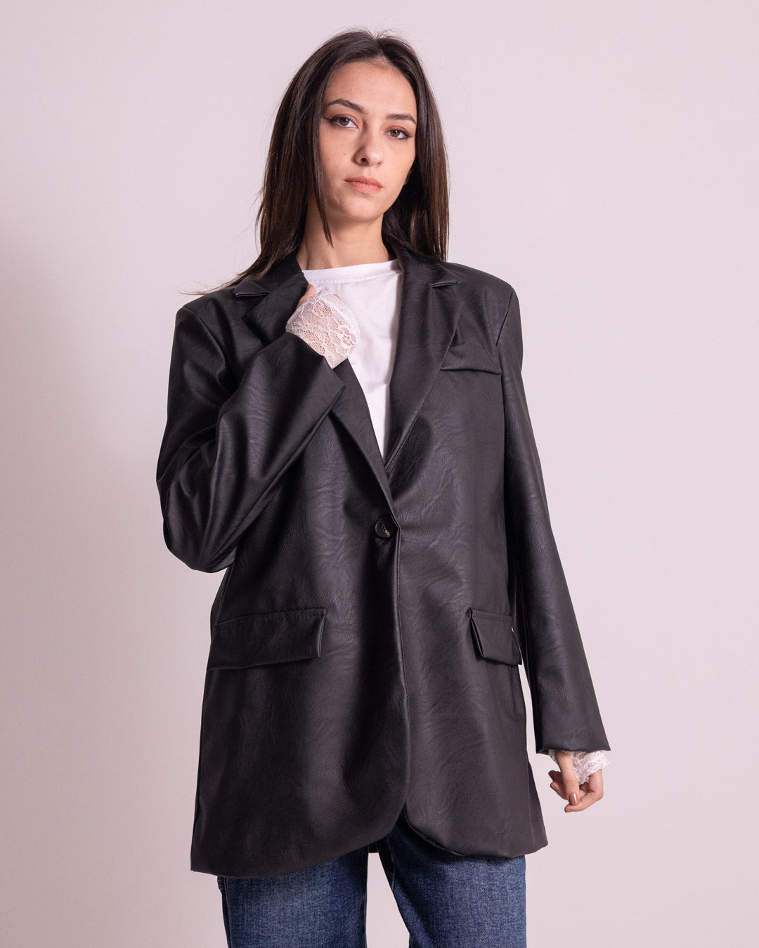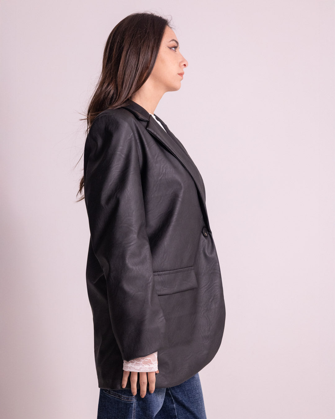 Giacca lunga in ecopelle che incarna lo stile contemporaneo con un tocco di sostenibilità. Realizzata in materiale ecopelle di qualità, offre un'estetica sofisticata e moderna, perfetta per chi desidera un capo versatile e di tendenza. La silhouette allungata garantisce una vestibilità elegante su diverse morfologie, mentre la taglia unica assicura praticità e comodità. Ideale per completare look urbani e raffinati, questa giacca rappresenta la scelta consapevole di chi segue le ultime evoluzioni della moda senza compromessi stilistici.