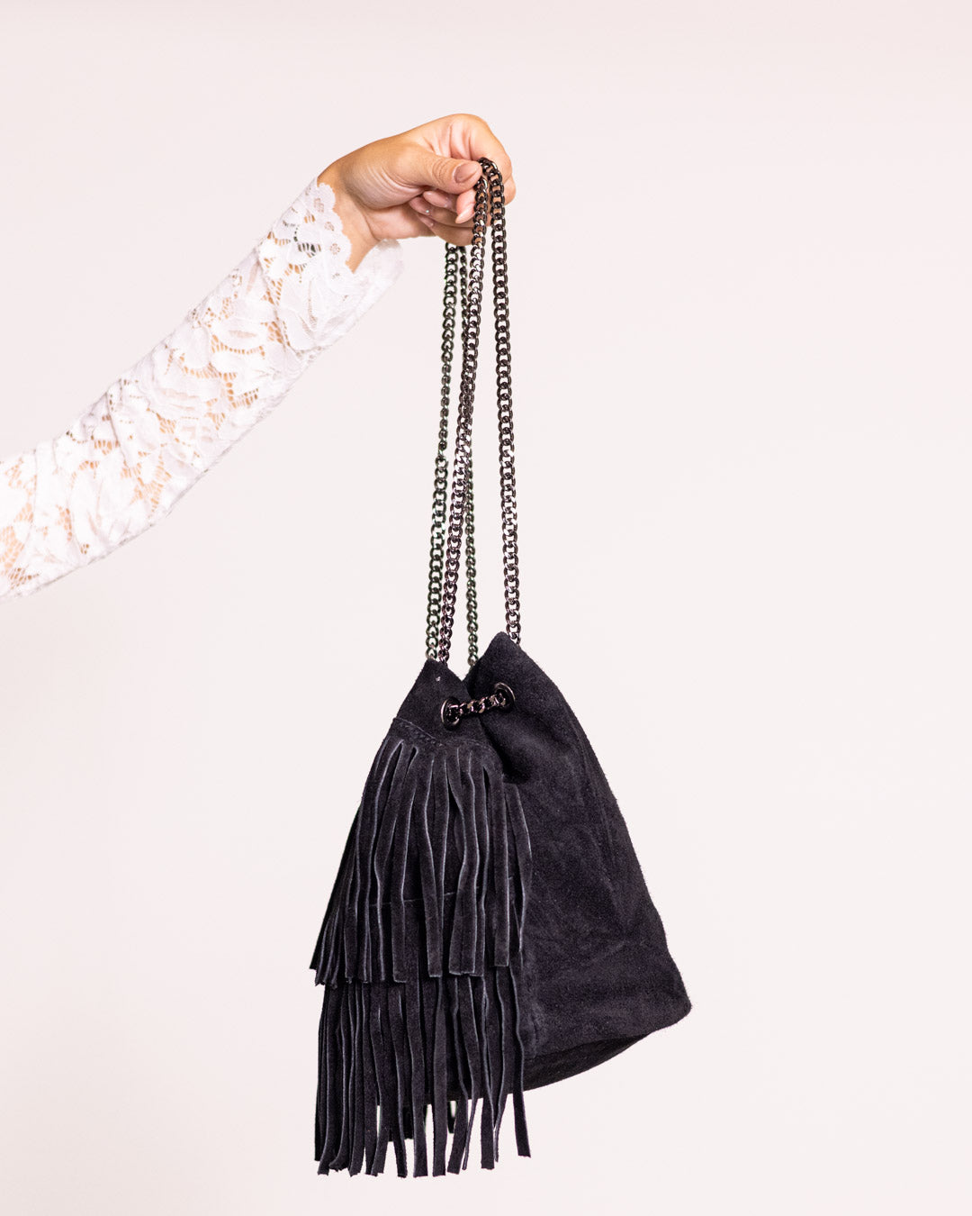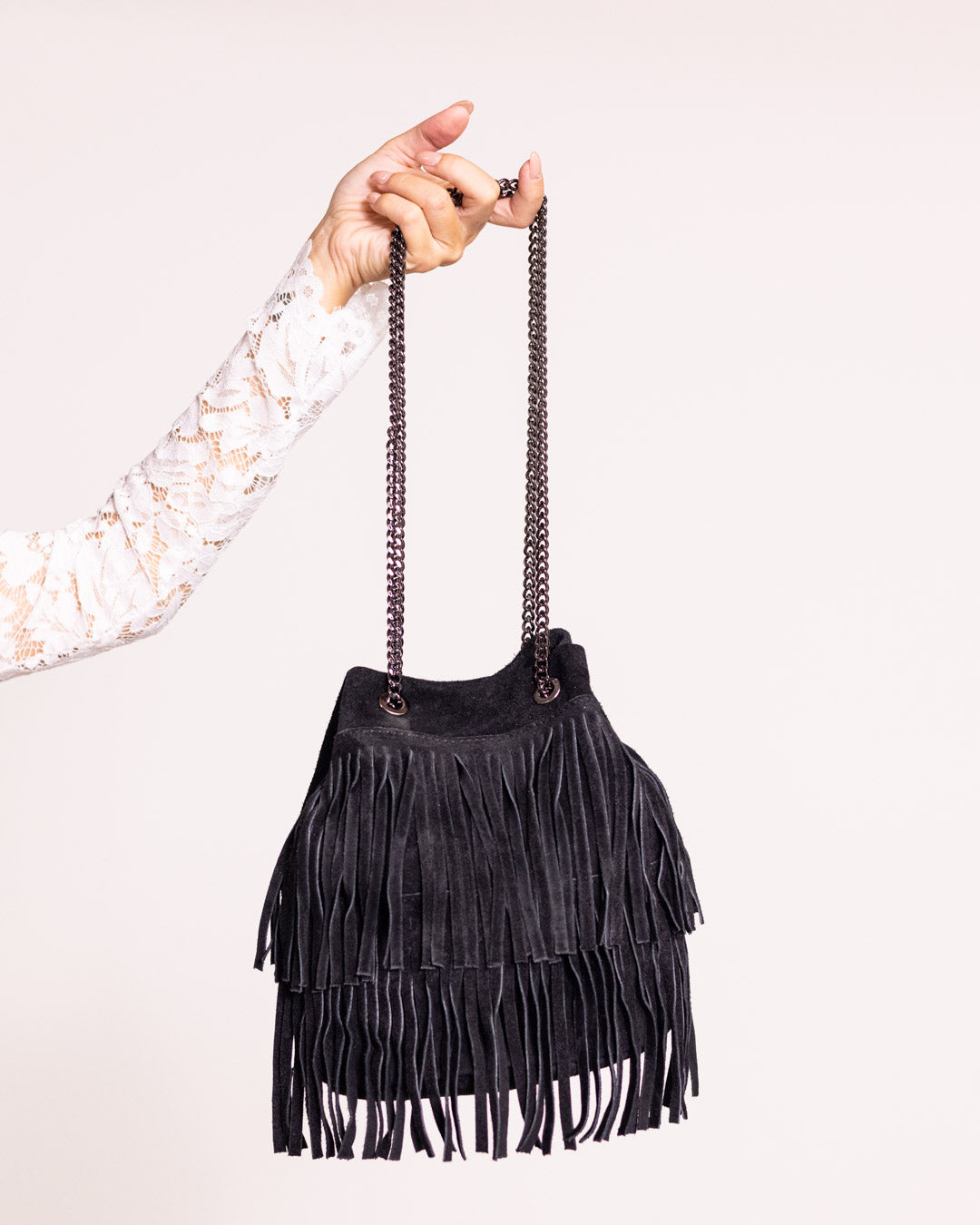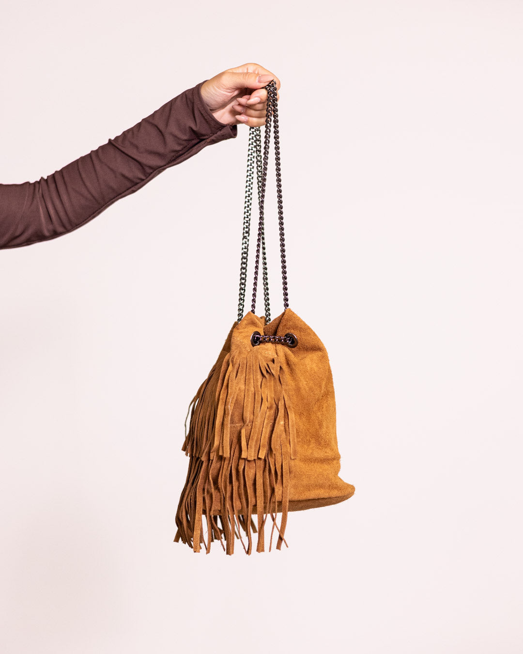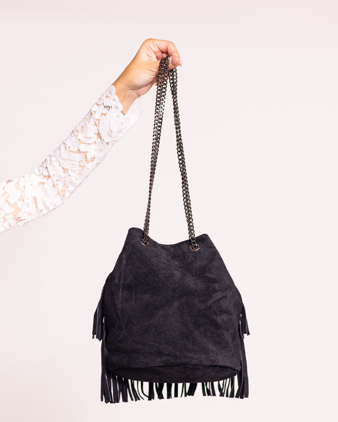 Questa pratica borsa a secchiello in vera pelle unisce funzionalità e stile raffinato. Le frange alla moda donano movimento e carattere, mentre il manico a catena aggiunge un tocco di eleganza contemporanea. Perfetta per chi cerca un accessorio distintivo e resistente, capace di completare con classe qualsiasi outfit.
