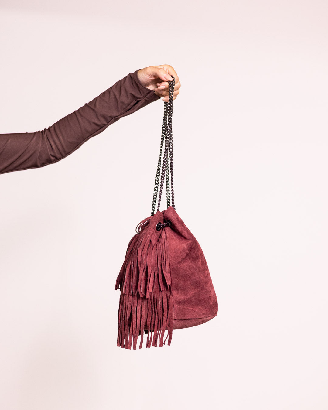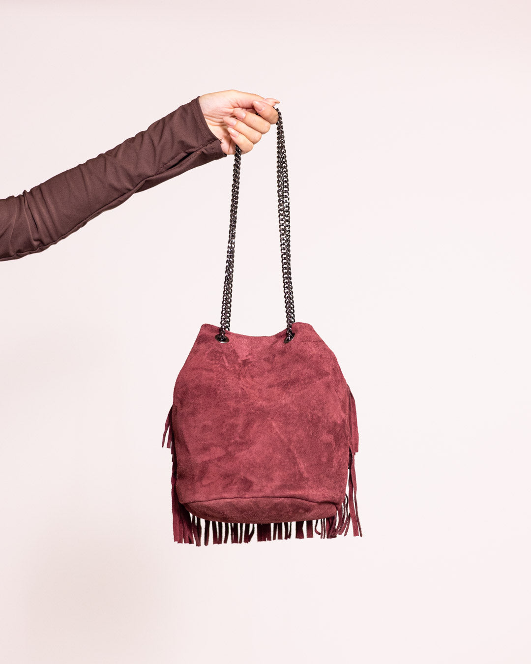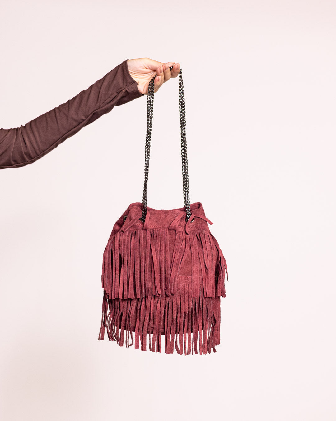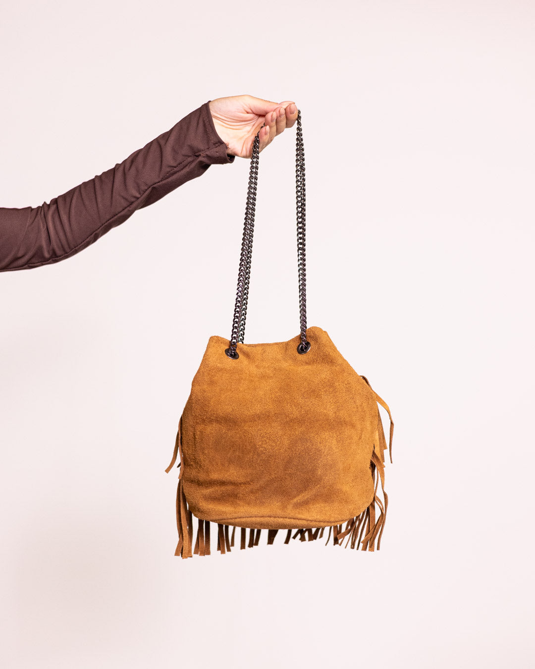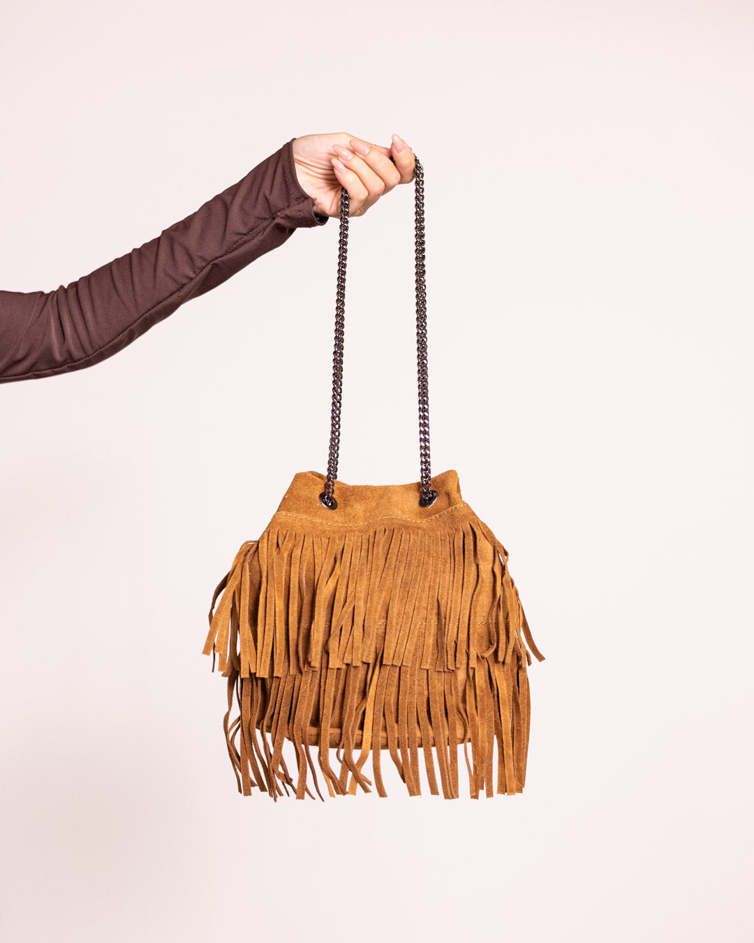 Questa pratica borsa a secchiello in vera pelle unisce funzionalità e stile raffinato. Le frange alla moda donano movimento e carattere, mentre il manico a catena aggiunge un tocco di eleganza contemporanea. Perfetta per chi cerca un accessorio distintivo e resistente, capace di completare con classe qualsiasi outfit.