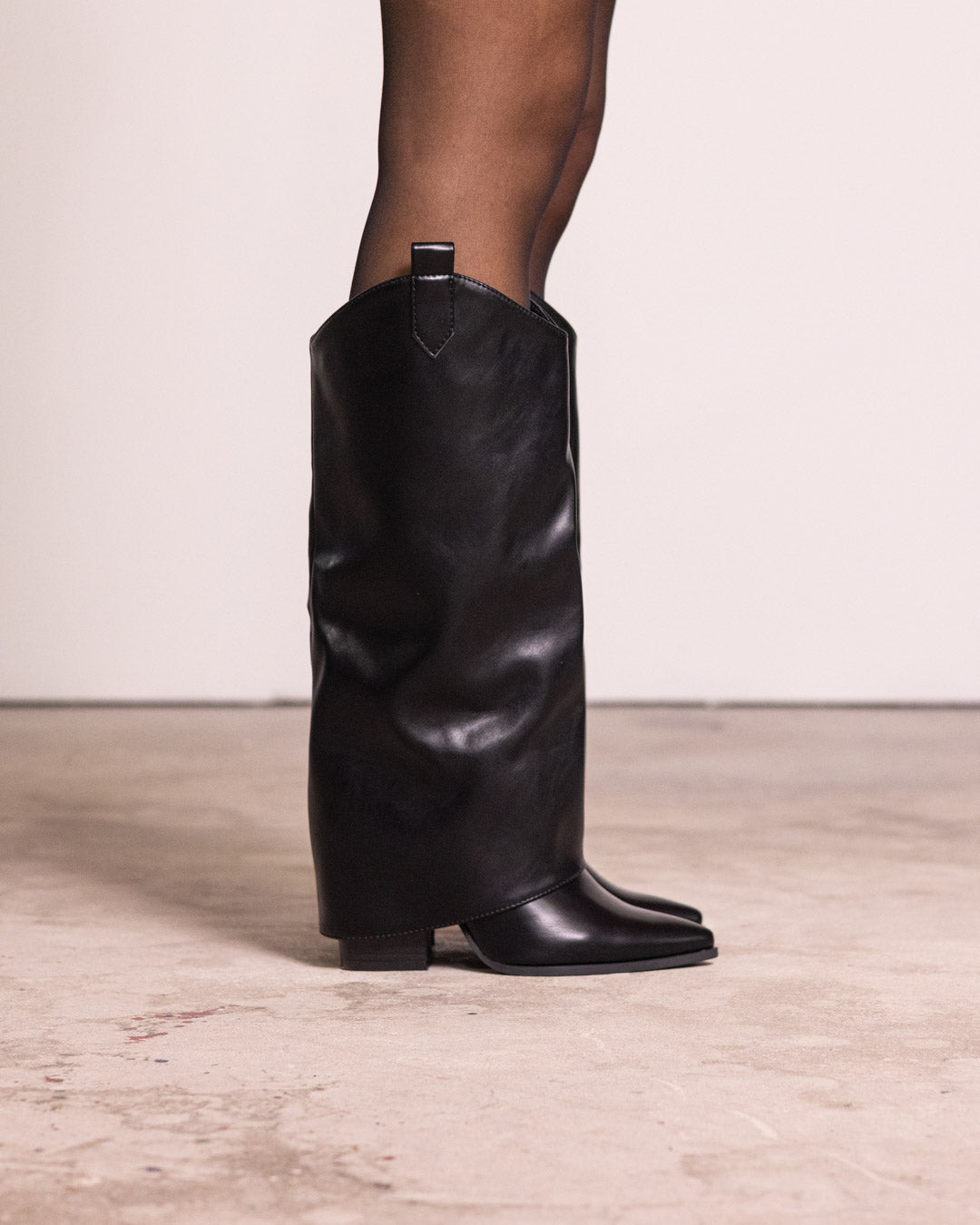 Questo stivale al ginocchio si distingue per l'ampio risvolto sul gambale, impreziosito da una fibbia decorativa che aggiunge un tocco di eleganza raffinata. La costruzione alta garantisce una calzata avvolgente e un sostegno ottimale, ideale per completare outfit sofisticati e di tendenza con un dettaglio distintivo.