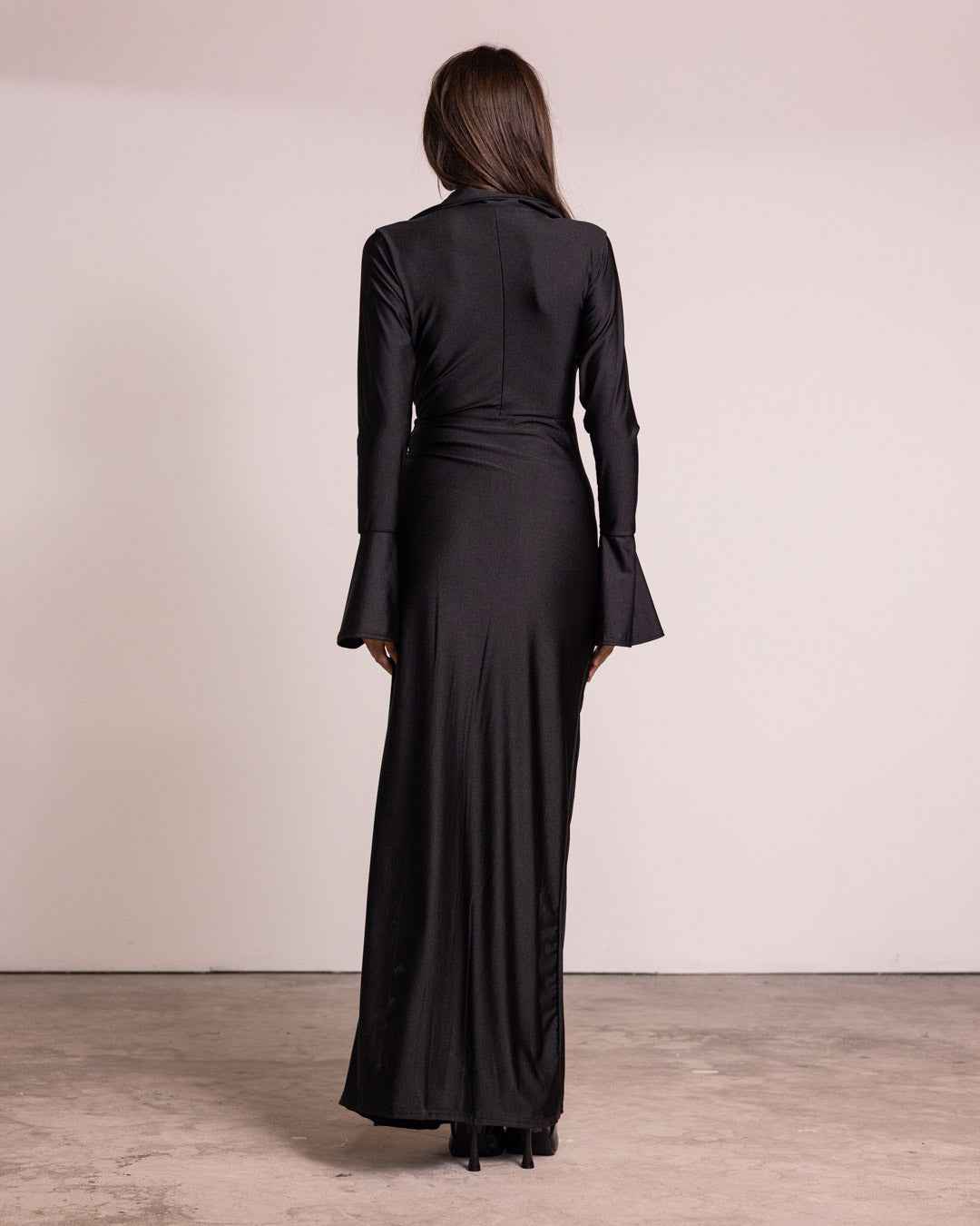 Vestito raffinato caratterizzato da maniche a campana che conferiscono un tocco di eleganza senza tempo. Il taglio fluido e la silhouette sofisticata lo rendono ideale per occasioni speciali, cene importanti e eventi formali. Le maniche ampie e ondeggianti creano un effetto drammatico e femminile, mentre la struttura del capo garantisce una vestibilità impeccabile. Perfetto per chi desidera un'opzione di abbigliamento che unisce stile contemporaneo e fascino classico.